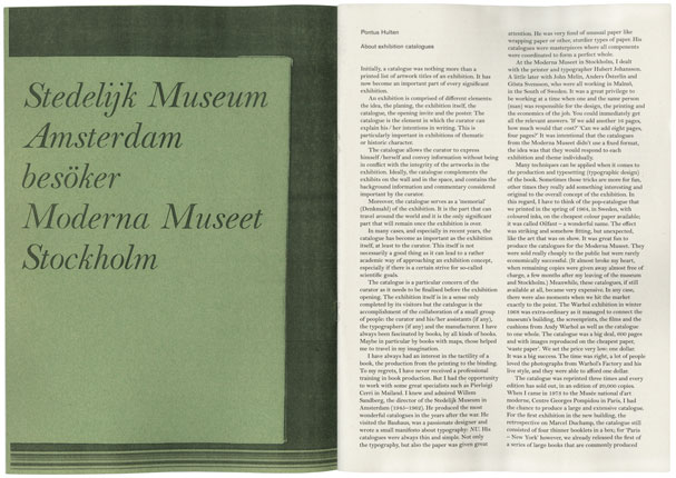 Pontus Hultén (1924–2006) worked at Moderna Museet from 1958 to 1973. As director, he was closely involved in the conception, design and production of exhibition catalogues and posters: a collaboration between director, designer, editor and printer. With the use of innovative formats, materials and production techniques to graphically represent each artist as a permanent artifact, the catalogue became as important as the exhibition itself.